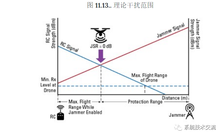 当无人机接收器处的 RC 信号强度大于最小 Rx 电平时,无人机是可控的。如果还存在干扰信号并且大于无人机的RC信号功率(当干扰信号比(JSR)≥0 dB时,则飞行员通常不再能够控制无人机。但是,这取决于遥控器的编码方案(见图11.13)。JSR 越大,CUAV 禁用无人机的可能性就越高。