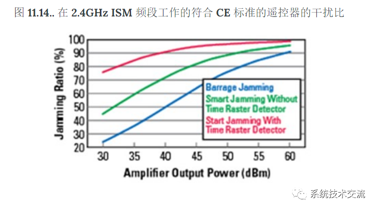 图 11.14 显示了使用符合 CE 标准的遥控无人机进行的干扰测试,上行链路在 2.4 GHz 频段。干扰器使用功率放大器连接到罗德与施瓦茨UHF全向天线,电缆为10米。评估了2021种类型的干扰信号:弹幕干扰、无时间光栅检测器的智能干扰和时间光栅检测器的智能干扰。该图显示了三种场景下的干扰比与放大器输出功率的关系,表明智能干扰比弹幕干扰更有效。(梅瑟,《》)