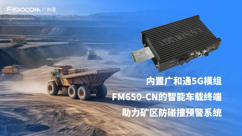 搭载了广和通5G模组FM650-CN的智能车载终端是车内网和车外网通信的枢纽,是一款集无线通信、GPS/北斗卫星、V2X通信于一体的物联网设备。FM650-CN基于展锐V510平台,支持中国三大运营商的全部5G频段,满足当前国内市场对5G高、中、低频段的不同需求。5G智能车载终端系统基于车规级ARM 架构处理器,可采集车内CAN 总线、千兆以太网等数据,通过4G/5G、V2X等无线通信方式,实现车端、车外设备及数据平台的数据传输。在智慧矿山场景中,以智能车载终端为核心的车端系统结合云端监管平台,可组成一套防碰撞预警系统。车端系统基于V2X通信技术和GNSS高精度定位,融合矿区地图及路网信息,能够实现各种场景下的碰撞预警功能。此外,矿区工作人员可通过云端平台对矿区所有车辆进行实时监控,对矿区地图、道路、告警事件等进行维护管理。