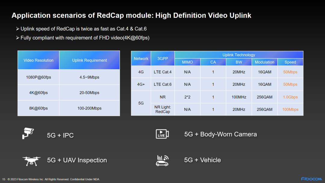 “相较于5G与LTE Cat.4模组,RedCap模组符合最新3GPP R17标准,其次RedCap模组采用4nm的芯片制程工艺,意味着具备更低功耗与更小尺寸”,广和通产品行销部总经理许良翮谈到:“虽然RedCap模组仅支持20MHz的频宽,且不支持载波聚合与5G非独立组网,但RedCap模组的最高下行速率仍可达220Mbps,较LTE Cat.4模组提升近50%。除了PCle和USB接口,RedCap模组还可支持高速网口。此外,RedCap模组支持OpenWRT操作系统,意味着其更适合Open CPU的应用设计,使得终端设计更紧凑,帮助终端客户减少开发时间和成本”。