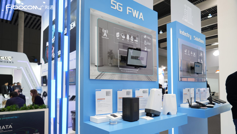 在5G FWA展区,广和通带来了多款搭载5G模组FG160、FG360、FG370系列的5G FWA解决方案,覆盖CPE、IDU、ODU、MiFi等丰富终端形态。FWA通过电磁波代替电缆作为信号传输的介质,避免了传统光纤接入所需要的挖沟、布线等繁琐过程,能够为地广人稀的区域提供灵活快速的宽带及WiFi覆盖,也能为小微企业/商铺及临时场所提供经济便捷的宽带接入,因而近年来被广泛应用于智慧城市、智能制造、智慧交通等物联网场景,市场前景广阔。广和通在发展迅猛的5G FWA市场扎根已久,积累了深厚的技术与市场优势,打造了许多成功商用案例,全球市场份额遥遥领先。