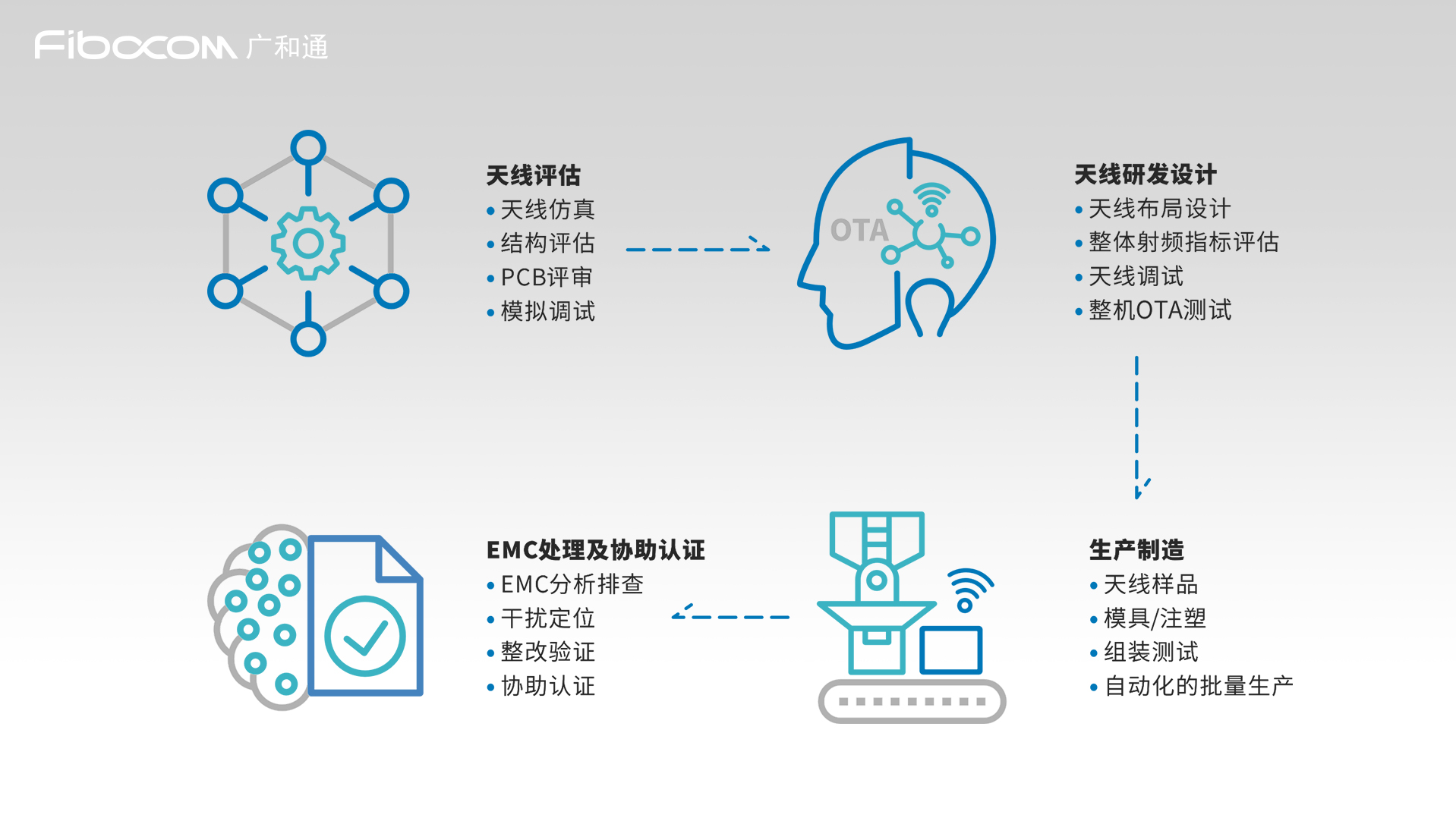 广和通完善的天线产品服务贯穿天线评估、天线研发、生产制造、EMC处理及协助认证多个环节,广和通天线团队紧凑高效的项目配合能力,大大缩短终端上市时间。