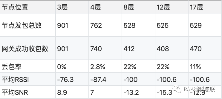 在楼层水平覆盖上,一台RAK7258网关可以完整覆盖网关所在楼层及相邻楼层。如网关在3楼,可以完整覆盖2,3,4层。另外,由于在楼层垂直覆盖上,存在信号从窗外绕射的情况,因此,即使存在诸多障碍物,一台RAK7258网关也可以比较好的覆盖与RAK7258网关所在半侧的1-17楼层。