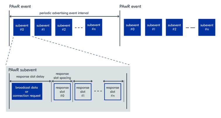 为了解释它是如何工作的,我们将使用广播器和观察者命名约定。广播并不是什么新鲜事,数据由广播公司发送,观察者扫描以接收它。PAwR中的新功能是,广播数据在确定性时隙内以小数据包组织,观察者可以精确地与之同步和响应。数据在由 PAwR 子事件组成的 PAwR 事件中发送。每个观察者可以同步到一个或多个子事件,并且同步时,观察者仅在这些特定时隙中主动接收。