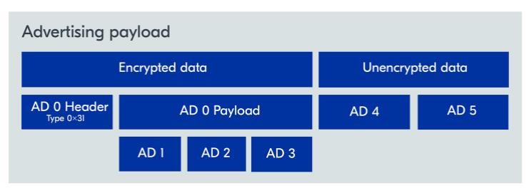 广告数据 0 封装了已加密的 AD 1-3。其次是未加密的 AD 4 和 5。这提供了灵活性,并使一些非关键广告数据保持开放,供任何观察者解释,例如,AD 类型 0x01(标志)或0x09(完整的本地名称)。
