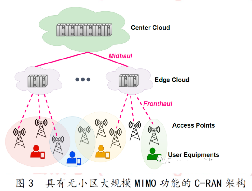 集中式计算处理单元及其与接入点之间的前传链路是预计在6G通信系统中发挥作用的实际无小区大规模MIMO操作的两个主要层。当边缘云位于接入点和中心云之间时,如图3所示,中传和由边缘和中心云组成的协作处理单元是无小区网络中的附加组件。