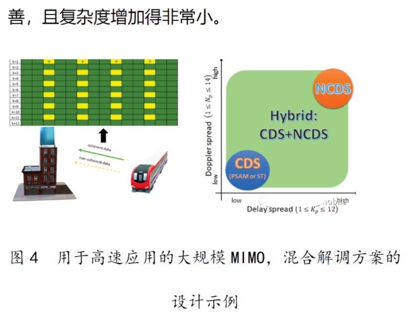 最后,在那些低等或中等移动性场景中,[11]中提出了一种混合解调方案(HDS), 其中包括用可以非相干检测的新差分编码数据流替换CDS中的传统参考信号。后者可以在不知道信道状态信息的情况下解调,并随后被用于信道估计。图4给出了-一个设计示例。因此,HDS可以利用CDS和NCDS的优势来提高频谱效率。据概述,信道估计几乎与CDS一样好,同时BER性能和吞吐量针对不同的信道条件得到改善,且复杂度增加得非常小。
