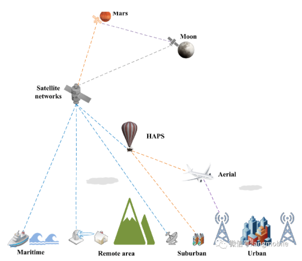④从大局来看,一方面,NGSO巨型星座将支持或高效协同GEO (地球同步轨道)网络、HAPS. 空对地网络、无人机网络等。这样-一个更大的NTN生态系统将带来更多处理共存和竞争的挑战。另-方面,空间使能的网络和大规模MIMO将扩展到近地空间(NES)以及从中性地球大层(160-200 公里)到月球轨道(约384400公里)的空间。例如,诺基亚贝尔实验室将为NASA的“Artemis 计划”在月球上部署第一个LTE网络。在拟议的太阳能通信和防御网络(SCADN)概念[13]中,基于整个太阳系大量航天器/卫星互联网的大规模MIMO传感和通信框架能够及早发现和缓解潜在威胁(例如小行星/彗星之于地球和地外人类基地的撞击威胁,并为太阳系内的无线连接提供基础设施。非常大的传播距离(地球与其他天体之间)和延迟对无线感知和通信提出了严峻挑战,这需要更多创新的解决方案,如人工智能、机器/深度学习、边缘计算、边缘人工智能、分布式和联邦学习等。