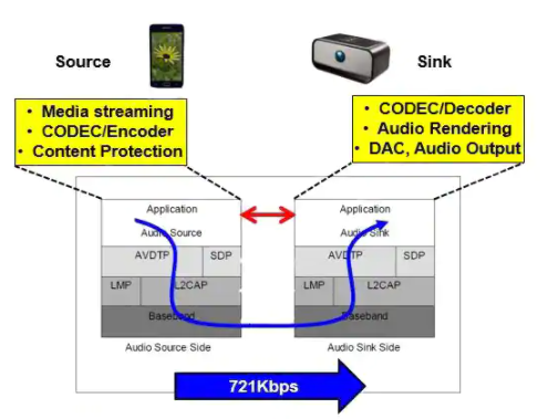 从全新“音频 + 控制”应用组合的角度看该图,发送设备 (source) 侧为手机,正在传输可以进行加密的编码数据(音频和控制)。 数据会最终找到进入基带层(蓝牙无线电)的途径。 数据流执行接收设备 (sink) 侧的协议堆栈,接收侧设备可以是上文提到的任何设备/智能家电。