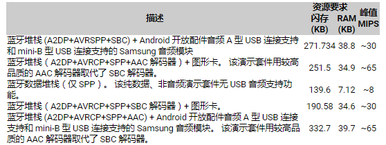 这些示例仅作演示之用,但组合在一起则说明一点,就是对于从最简单(仅蓝牙数据堆栈)到最苛刻的应用(多规范和高品质 ACC 解码器)来说,存储器和峰值 MIPS 会出现显著变化。