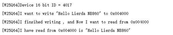 B:使用SPI驱动外挂SPI FLASH往其特定地址(0x004000)写入字符串,并利用NB860模组SPI读取外挂SPI FLASH该地址内存,并将读取到的字符串打印到串口,下图是串口日志信息。