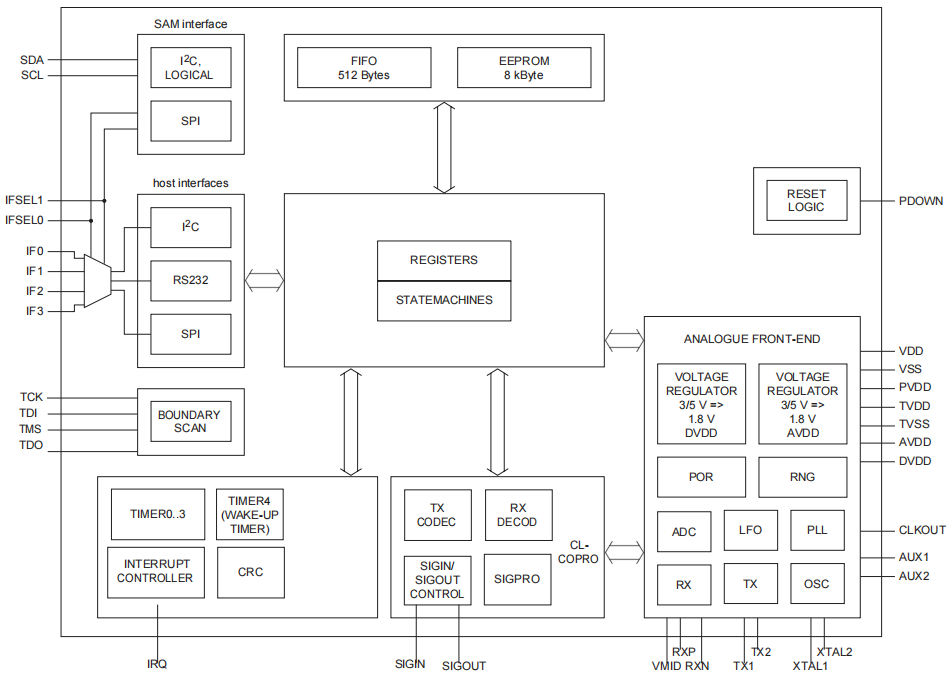 - 灵活和高效的省电模式,包括断电模式,待机模式和低功耗卡片检测