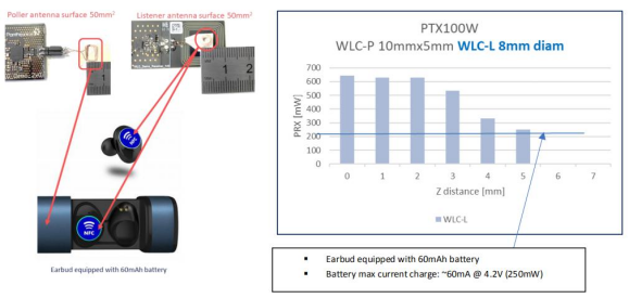 上图为应用在TWS蓝牙耳机的实例,经测量无论是输出端的体现还是接收端的天线面积都控制在了50mm²左右,小尺寸的天线为可穿戴设备提供了较高的灵活性。通过测试发现,基于PTX100W芯片的电力无线传输距离最远为5mm,两个天线间隔距离在0~2mm时,充电效率达到最大。