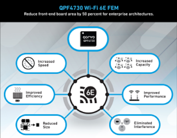 中国北京 – 2022 年 1 月 11日 – 移动应用、基础设施与航空航天、国防应用中 RF 解决方案的领先供应商 Qorvo®(纳斯达克代码:QRVO)今日推出首款覆盖 5.1 GHz 至 7.1 GHz 频段的宽带前端模块 (FEM), 用于CPE。Qorvo的新宽带QPF4730可以为Wi-Fi 6和Wi-Fi 6E企业解决方案提供全频支持。