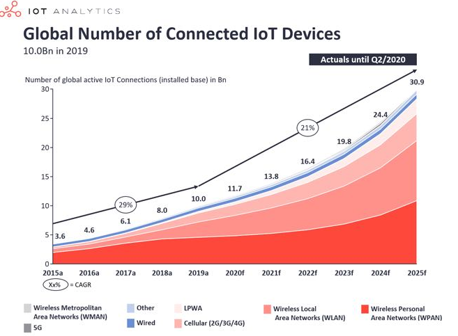 根据物联网市场研究机构IoT Analytics的数据,2020年物联网连接数达到117亿,而非物联网连接数保持在100亿左右,这是物联网连接数首次超越非物联网连接数,预计到2025年物联网连接数将增长到309亿左右。但是,不论是目前还是未来,采用短距离通信技术的物联网设备连接数都占据连接数的绝大多数份额,2020-2025年其比例基本稳定在70%以上,采用蜂窝物联网技术的广域物联网设备仅占不足30%。