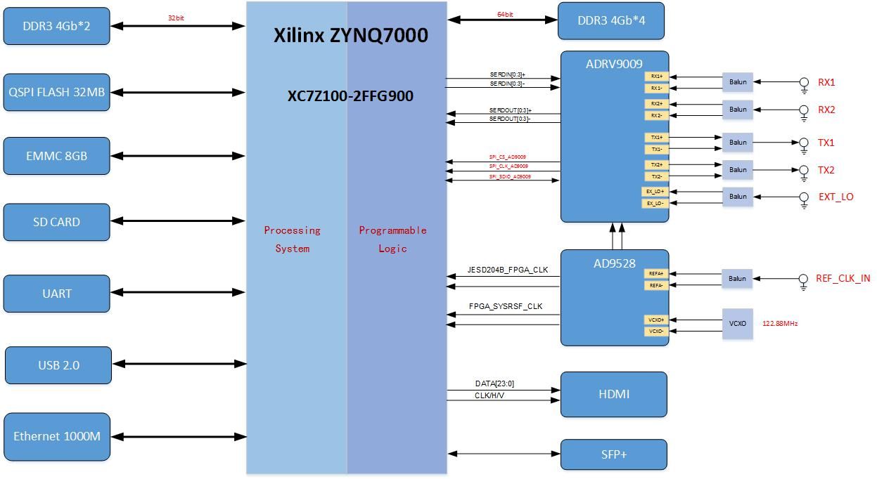 板卡使用XC7Z100 作为主处理器,包含Dual ARM Cortex-A9核处理器的嵌入式处理,PS端32bit 1GB容量DDR3存储,1路RS232接口,1路USB接口1路10-100-1000网络接口,PS端QSPI flash存储,PS端SD卡,Emmc存储;PL端64bit 2GB容量DDR3存储,PL端扩展HDMI 输出实现视频显示应用,PL端扩展9路I/O,4个LED指示灯。