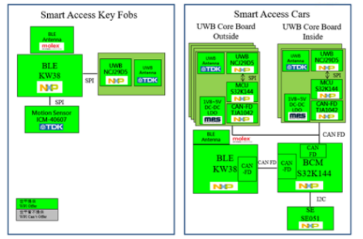 本方案主要分为5部分,即:钥匙端、车身锚点、车内锚点、基站蓝牙和BCM,其中,钥匙端由BLE KW38 + UWB NCJ29D5组成。NCJ29D5是NXP推出的新一代超宽带(UWB)IC系列的第一款产品,专用于满足全球汽车业的连接和功能安全需求。UWB IC使汽车准确识别用户位置,定位误差精确到厘米级别。这可为基于智能手机的汽车接入技术提供与一流遥控钥匙相同的便利性。用户将手机放在口袋或包中便能够打开和启动汽车,并通过智能手机享受安全的远程泊车服务。此外,新的UWB IC还可最大限度地防止通过中继攻击盗车的风险。