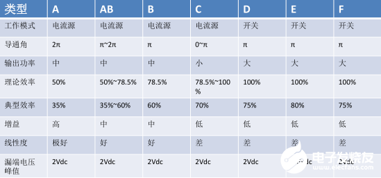 传统线性功率放大器具有较高的增益和线性度但效率低,而开关型功率放大器具有很高的效率和高输出功率,但线性度差。具体见下表: