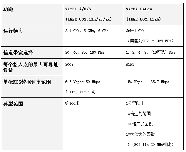 表1:Wi-Fi 4/5/6与Wi-Fi HaLow比较