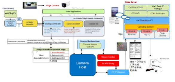 本方案中采用的Orbit AiCam是Orbit开发的一款车辆识别算法。其以AI深度学习的基本架构为基础,并使用Intel® OpenVino toolkit™ AI开发工具辅助加速。通过在装有Intel® Movidius™ Myriad™ X加速器的AI Camera上运行,可使摄像机具备AI侦测车辆与车牌位置的功能。