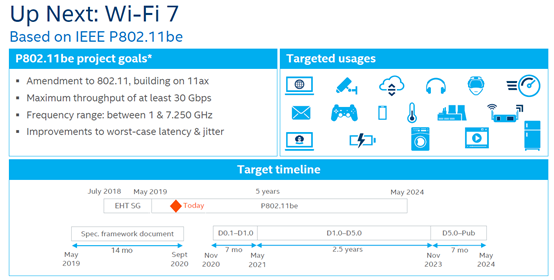 根据此前,英特尔发布的一份报告显示,WiFi 7标准工作组在2018年就已经成立,2019年5月份开始指标、框架工作文档的构建。按照规划应该会在今年5月份完成第一版草稿,不过,到目前为止,<电子发烧友网>在WiFi联盟官网和IEEE的官网上都未找到新的草稿内容,估计应该是延迟推出了。