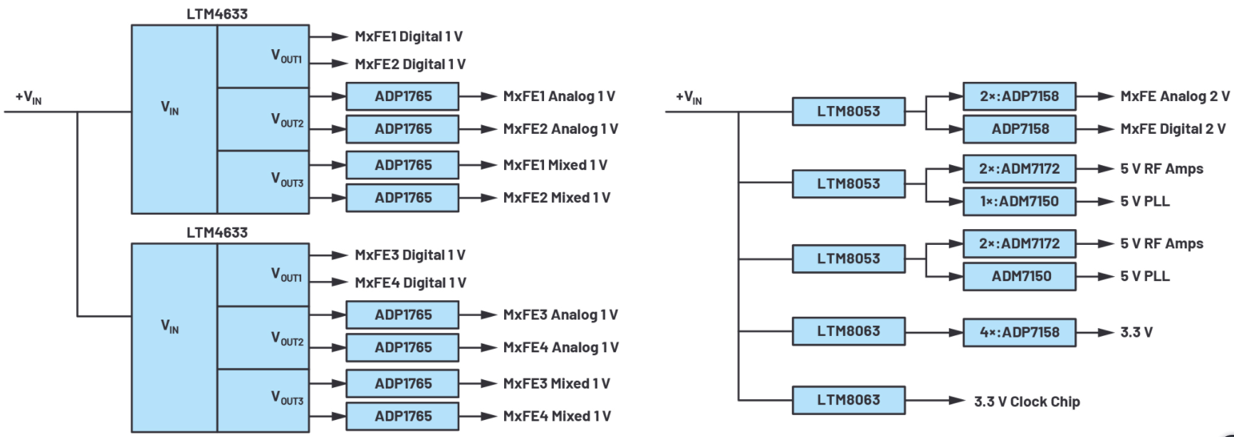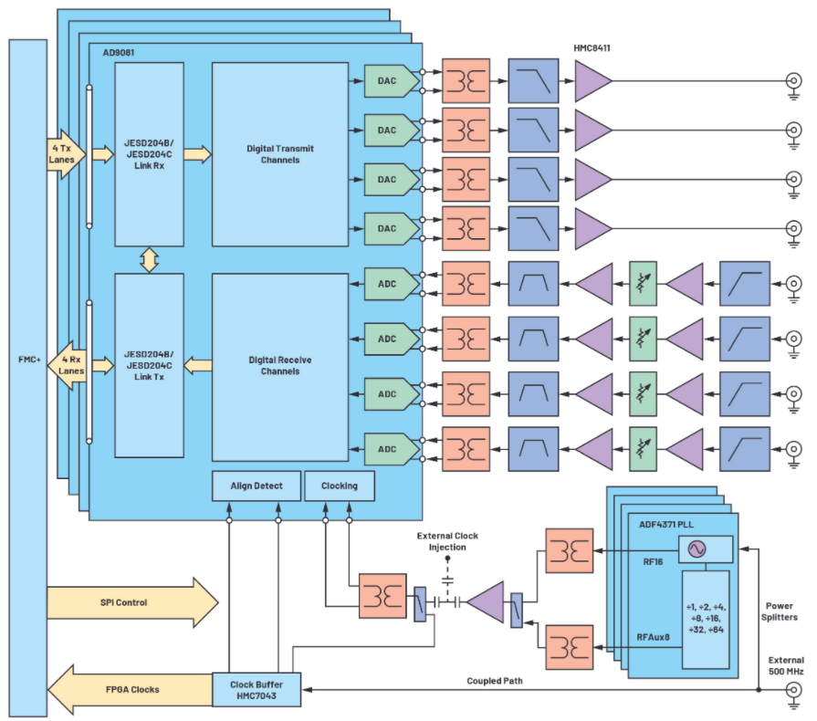 ADI公司推出的这款16通道、直接RF采样开发平台如图2所示,其框图如图3所示。为了说明其命名约定:我们将集成式转换器命名为混合信号前端(MxFE),将包含4个MxFE的16通道板命名为四MxFE。4个MxFE每个包含4个DAC和4个ADC,所以共有16个发射通道和16个接收通道。