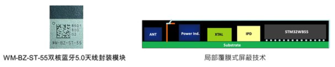 WM-BZ-ST-55双核蓝牙5.0天线封装模块&局部覆膜式屏蔽技术WM-BZ-ST-55双核蓝牙5.0天线封装模块尺寸为7.2 x 9.3 x 0.96毫米,整合意法半导体的STM32L4 Arm® Cortex®-M4 MCU的功能与Cortex-M0 +专用内核來管理射频芯片。这个独立的紧凑型模块,采用部分金属溅镀屏蔽封装,内建意法半导体(STM)STM32WB55系列RF系统单芯片,支持 BLE5.0, Zigbee 和 Thread 无线连接,并集成蓝牙低功耗2.4GHz天线。