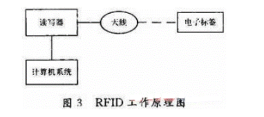 读写器通过天线向外发送出一定频率的射频信号,当电子标签进入到读写器产生的磁场有效作用范围内时产生感应电流从而获得能量,向读写器发送出自身编码等信息,读写器读取信息并解码后,将信息传至计算机系统进行相关处理,从而达到自动识别物体的目的。RFID工作原理图如图3所示。
