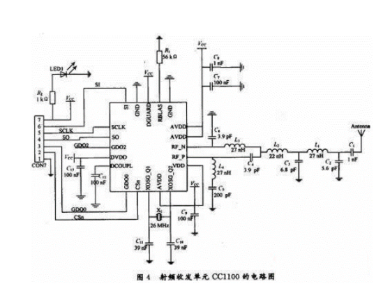 该部分包括射频芯片和天线,芯片使用CC1100,该芯片能对频率为915 MHz的超高频标签进行读写,符合EPC CLASS-1/Gen-2标准。内部的发射器部分不需要增加有源电路就能够直接驱动近距离操作的天线,读写距离可达到10 m左右,可以满足手持式交通违章处罚终端的要求。射频收发单元CC1100的电路图如图4所示,其中CC1100的信号线SCLK(时钟输入)、SI(数据输入)、SO(数据输出)、CSn(芯片选择)分别与