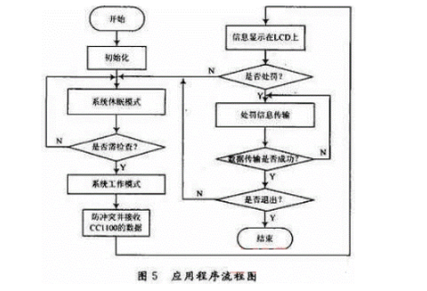 用户应用程序是基于Qt的图形界面,当交警确认要求对车辆进行检查或者罚款时,系统中断进入工作模式,通过防冲突算法获得车辆的信息,并将信息显示到LCD上,如果确认要对司机进行处罚,选择好违章代码后,将相应的信息通过GPRS发送到控制中心,否则进入到系统的休眠模式,继续等待中断发生,其流程图如图5所示。