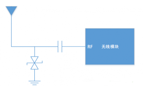 在使用无线模块的时候,从无线模块产品手册上有时会看到天线端需避免静电直接打到天线的射频接口,甚至用手去拿模块最好都要带上防静电手套。这就说明无线模块的射频输出端是对静电敏感的,超过一定的静电等级可能会使得无线模块受到永久性的损坏。此处推荐一种无线模块射频输出端的ESD设计电路结构,如图3所示。