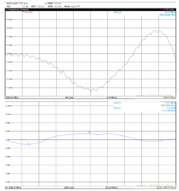 进行幅频响应测试需要用计算机程控信号源步进改变基带频偏,频谱仪的测量迹线采用最大保持功能。从图11看出,从900MHz到940MHz,该正交调制器评估板的幅频响应最大值7.8dBm,最小值7.1dBm。需要特别注意的是,上述的幅频响应测量结果是对ADL5371评估板的测量结果,如果要得到ADL5371芯片的1dB和0.1dB带宽,还需对评估板电路的电路特性进行校准并修正。