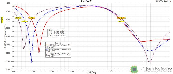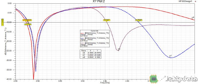 从图中能看到,当L1逐渐变大时,天线在低频的工作频段逐渐减小,而高频的整体工作频段几乎没有收到影响,因此可以得到结论,L1对低频的工作频段具有决定性的影响,而对高频的影响几乎可以忽略不计。