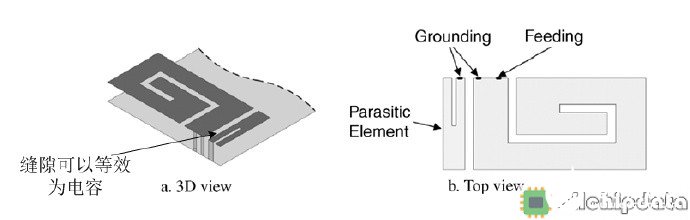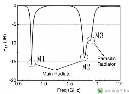 如图10所示是一个通过添加寄生分枝来拓展高频带宽的例子,该天线是一个工作于GSM/DCS/PCS频段的手机PIFA天线,如下: