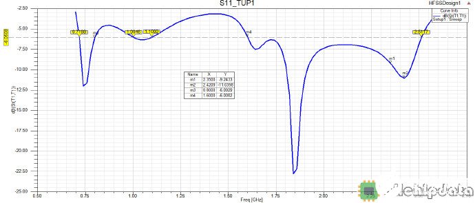D分枝和E分枝属于直接馈电的原生分枝,D直接实现1800MH左右的工作频段(长度接近于1800MHz的0.25个波长);E分枝在2.3GHz附近产生谐振(其长度接近2.2GHz的0.25个波长);