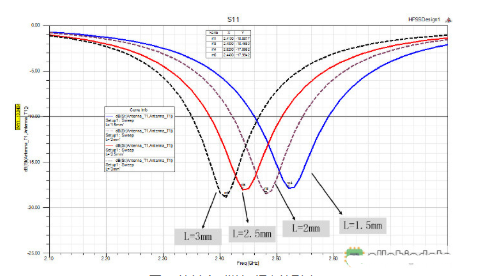 通常,我们设计中需要在蛇形天线的末端预留一段用变量表示的枝节,如图6中最右端所标示长度为L的枝节,做优化时,只需要简单的改变此段长度即可,例如,我现在在刚刚建立的模型上做一个示例,令L分别等于1.5mm,2mm,2.5mm和3mm时,来求解其对应的工作频段,求解结果如下: