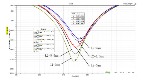 S11的决定因素是天线的输入阻抗,通常,单极子天线默认的输入阻抗为50欧姆,当所设计的天线输入阻抗无限接近50欧姆时,则S11将逼近无限小,反之,当输入阻抗偏离50欧姆时,则S11将变差,换句话说,输入阻抗偏离50欧姆越大,则S11越差。对于本文中所设计的天线结构,如图6所示的L2短路枝节,可以通过调整L2的长度来改变天线在2.45GHz频段上的输入阻抗大小,进而调整S11参数。我现在在模型上做一个示例,令L2分别等于4mm,4.5mm,5mm,5.5mm和6mm,来看其对应的S11的值,仿真结果如下: