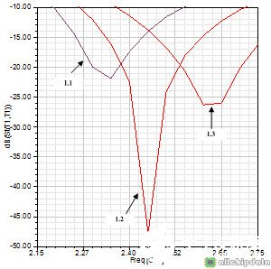 从S11参数来看,天线的工作频率覆盖了2.3G–2.6G(S11<-10),达到了我们预期的设计要求,下面我们来看一看L,H和S对天线性能的影响,如下图: