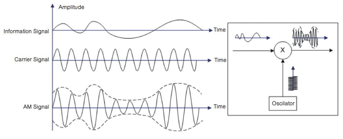 要使用更小尺寸的天线,就需要更高的信号频率,这正是我们对信号进行调制时所做的事情。调制就是将低频信号编码到高频可传输信号的信息中(见图5)。较简单的方法(但不是唯一的方法)是将低频信号乘以高频载波。结果是调幅(AM)信号,也就是和老式汽车收音机中的是一回事。使用蓝牙时,这一载波的频率为2.4GHz,这样可以将天线尺寸减小到约2cm。这也就是我们不再看到天线的原因之一——它们足够小,可以隐藏在我们的电子设备中。