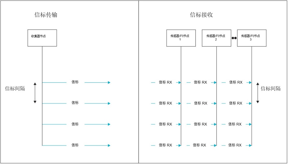 信标模式包括在固定的时间间隔内从数据收集器广播一个信标,所有的传感器节点都能接收到。它使单个传感器节点和收集器之间的通信同步化。传感器节点只有在接收到信标时才会被唤醒,如果收集器想在下一个信标之前发送或接收数据,破译信标会给传感器提供信息。此过程可以使传感器可在过渡期间切换到睡眠模式,这对于故障指示器来说理想选择。