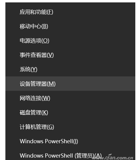 首先,用Win+X呼出菜单,选择“设备管理器”。