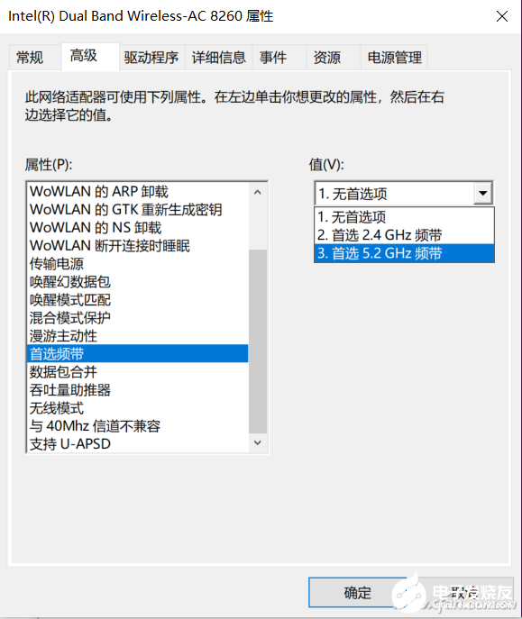 如果电脑好路由器都支持5G频段的话,还可以切换选项卡到“高级”处,下拉滚动条到“首选频带”,将值修改为“首选5.2GHz频带”。使用这个频段可以避免电脑旁边的家用电器、无线键鼠的干扰,也可以减少掉线的几率。