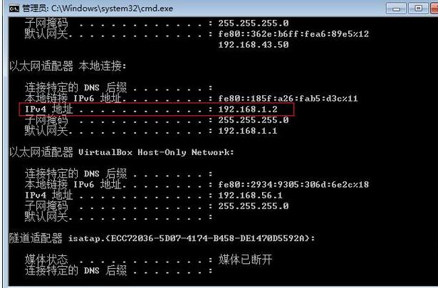 打开电脑windows菜单,在左下角搜索程序和文件对话框输入cmd并回车,在弹出的对话框中输入ipconfig并回车,IPv4地址显示的地址为(如下图):192.168.1.2,一般情况下,路由器的默认登录地址为IP地址最后一段数字换成1,即登录地址为192.168.1.1,其他地址段也可按此方法判断。