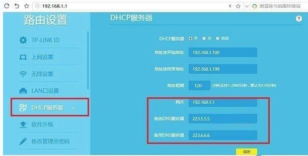 DHCP配置:DHCP服务器选项中,DHCP服务器选择开,DNS服务器地址如果运营商未提供,首选DNS服务器配置成8.8.8.8,备用DNS服务器配置成114.114.114.114,其他选项默认。