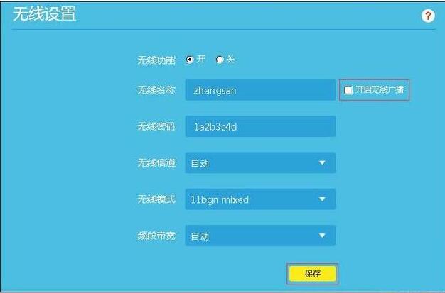 无线配置:无线设置中,无线功能选择开启,输入自定义无线名称,和无线密码,其它选项默认。