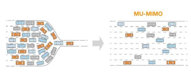 一条道路,车辆多,道路很拥堵。MU-MIMO技术相当于增加了多层(多条)道路,从而大大提高交通效率。