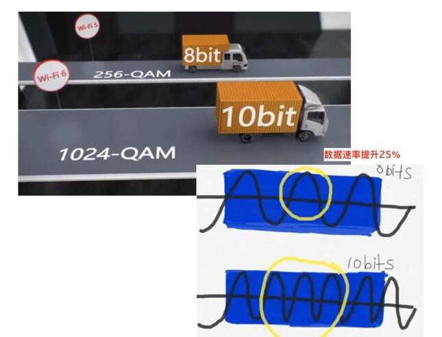 Wi-Fi5支持256QAM(8bits/符号),而Wi-Fi6支持1024QAM(10bits/符号),增加了25%,好比每辆汽车能装载的货物更多,数据传输速率也就提升了25%。