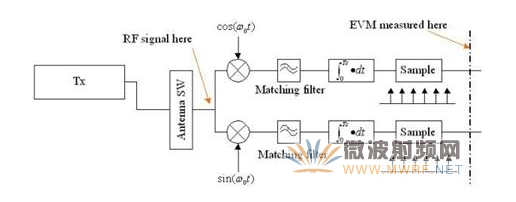 EVM是衡量发射机发射信号调制精度的一个重要指标,需注意的是该指标不是简单定义射频信号的调制精度,而是先将射频信号映射到I/Q平面,然后经过匹配滤波器,再抽样得到离散的I/Q数值,EVM衡量的是该离散I/Q数值的精度。图2是一个示意图。