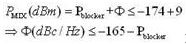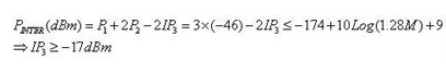 3GPP规定TD-SCDMA终端当存在一个调制类型的干扰信号在±4.8MHz处,电平为-49dBm,系统灵敏度可下降3dB。如果我们认为灵敏度下降是因为交叉调制产物所导致的, 只要交叉调制产物功率不大于灵敏度电平时的带内总噪声功率,则该指标就没有问题。假定接收通道噪声系数为标准所要求的最低指标:9dB,由此我们可以推出该指标所要求的等效三阶截止点,该三阶截止点与输入阻塞信号的频率偏移量有关,因为接收通道包括信道选择滤波器。