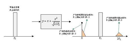 即便是频点f2处所要的信号不是点频信号,交叉调制产物依然存在,且电平大小同样由方程3式给出,只是这时交叉调制产物的频谱形状不再是三角形,而是三角形与信号功率谱密度函数的卷积。上面得出的公式是基于正态噪声这一假设的,一般干扰信号与正态噪声相比更接近恒包络信号,交叉调制产物会小一些,当干扰信号为恒包络时,交叉调制产物为零。